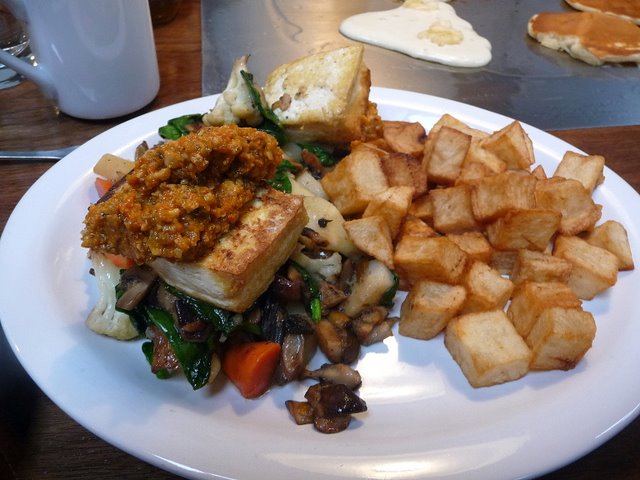 2. The benedict dishes: we tried the veggie and the pork belly confit. The veggie one was actually better- the pork belly portion was pretty small- there was much more tasteless carrot ribbon and of the four pieces of belly one was pretty fatty. I was going to write a comment card on it- and found someone had already filled it in! She had the same comments about the pork belly and the carrots as I did. I also found the english muffin overcooked (had to really use some knife work to cut pieces), and was not able to detect any extra flavor from using bacon fat in the hollandaise. The hollandaise at Mother's is better. The veggie version of a benedict, with seared tofu, romesca, polenta, and seasonal root veggies had more flavor then the confit of pork belly, pickled carrot ribbons and bacon fat hollandaise, which is a sad statement. The side of potatoes in both dishes was a good portion but tasteless until you added one of the hot sauces on the table.