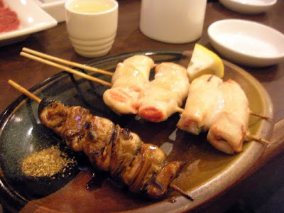 Last night at Shabu Toki in Boston, they offered more interesting yakotori then I’ve seen on Ping’s menu, For instance, besides the usual various chicken parts, they also offer pork belly combinations such as Aspara Kurobuta (black pork belly and asparagus) or Uzuura Kurobuta (black pork belly and quail egg) or Kurobuta Baraniku Negi Ponzu (blakc pork belly with scallion and ponzue sauce), as well as Lamb Chop, seafood such as Sake Mozzarella of salmon and mozzarella, Unagi, and Scallops with spicy tobiko sauce, and even ginkgo nuts or garlic.