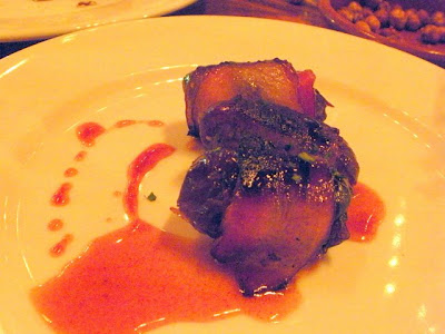 I did get to try two pinchos (the tortilla is actually a tapas dish, though the bread and butter/olive oil is a pincho). One was the Manchego and Paprika Fritters with spicy salsa roja. These fritters are very small- think the size of the dime. I tasted more of the friedness than the manchego and paprika, and they were timid with the salsa, sadly. Disappointing. Thankfully, at the same time these fritters arrived, so did the Griddled Bacon Wrapped Dates with warm honey. At $6 and 3 dates in the dish, you're talking about $2 a piece for a date with its bacon wrapper and drizzle of sweet honey. But, this delicious complexity of flavor is worth ordering every time.